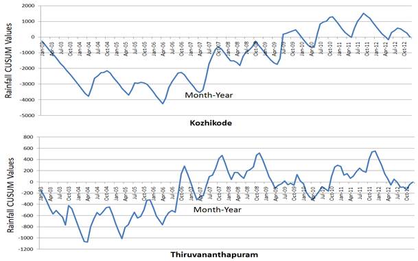 For all the stations, there was no evidence of significant trends (due to lack of strong evidence against H0 ), therefore, no trends were observed in Mumbai, Goa, Honavar, Udupi, Kozikode and Thiruvananthapuram rainfall data as the computed statistic were found to be less than the critical value at . Rainfall showed a very small increasing trend except in Mumbai, where a small decreasing trend was observed.
