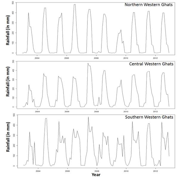 Figure 59 shows the rainfall time-series plot of forest cover for northern, central and southern Western Ghats, all of them highlighting a seasonal component. Figure 60 shows the decomposition of additive time-series into original time-series (top), the estimated trend component (second from top), the estimated seasonal component (third from top), and the irregular component (bottom). The highest seasonal factor is observed in July and August and the lowest is recorded from December through April for each year in northern Western Ghats. The estimated seasonal component shows increasing trend in rainfall from May to August and a decreasing trend from September to April in this region. In central and southern Western Ghats, highest seasonal factor is seen in June and lowest is observed in January–February. Here, the estimated seasonal component shows increasing trend in rainfall from April to June and a decreasing trend from July to March.