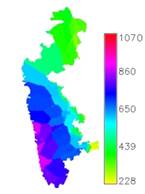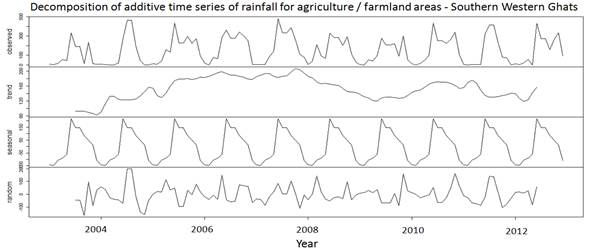 Figure 62 shows the rainfall time-series plots over agriculture/grassland areas for northern, central and southern Western Ghats highlighting a seasonal component. Figure 63 shows decomposition of additive time-series into original (top), estimated trend component, estimated seasonal component, and the irregular component (bottom). The highest and the lowest seasonal factor of rainfall in agriculture/grassland LC was similar to that of forest LC type (i.e. high in July and August and low from December to April) in northern Western Ghats. The estimated seasonal component also showed increasing trend in rainfall from May to August and a decreasing trend from September to April. Even the central and southern Western Ghats indicated similar trends of rainfall in agriculture/grassland areas as that of forest cover i.e. highest seasonal factor was seen in June and lowest was observed in January–February. The estimated seasonal component also showed increasing trend in rainfall from April to June and a decreasing trend from July to March.