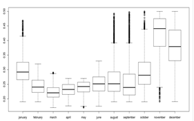 Figure 4: Boxplots for dense vegetation, agriculture/grassland, soil/settlement and water for the year January, 2003 and December, 2012 for northern Western Ghats (X-axis: Month, Y-axis: NDVI values).