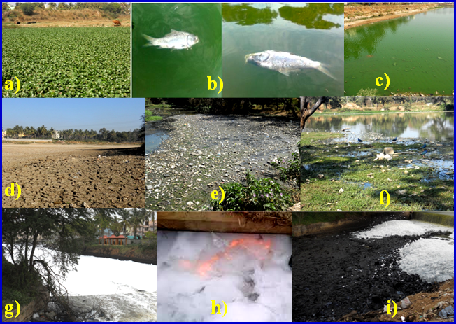 Wetland loss and degradation are due to conversion of wetland to non-wetland areas, encroachment of drainages (raja kaluves) through land filling, pollution due to sustained discharge of untreated domestic sewage as well as industrial effluents and dumping of solid waste, hydrological alterations (water withdrawal and inflow changes), and over-exploitation of their natural resources. These anthropogenic activities results in habitat degradation, weed infestation due to nutrient enrichment, loss of biodiversity and decline in goods and services provided by wetlands (Ramachandra, 2010). Pollution of water bodies is due to: