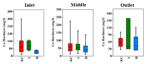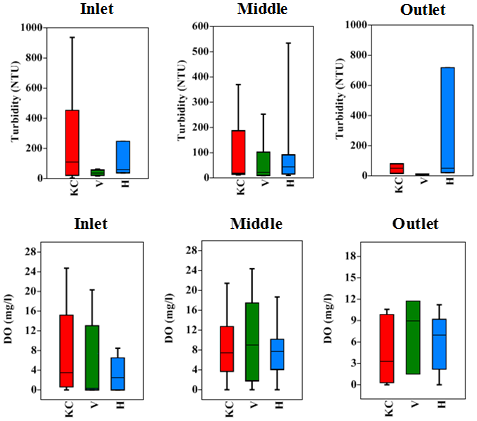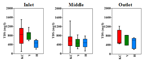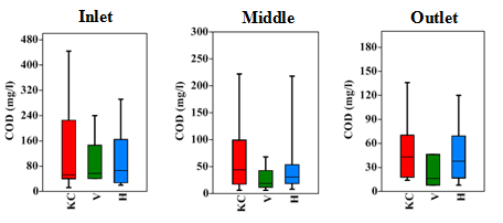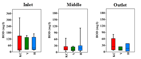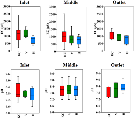 At outlets, KC valley has higher TDS, EC, COD, BOD, chloride, hardness and sodium. Alkalinity and DO are higher in Vrishabavathi Valley as the lakes support more algae growth. Hebbal Valley has higher pH, turbidity, orthophosphate, sodium and potassium. The physico-chemical parameters in outlet of different Valleys are in the order KC > H > V. Lakes in Hebbal valley have high phosphate content at the inlet, middle and outlet.