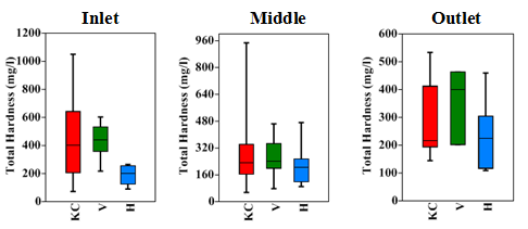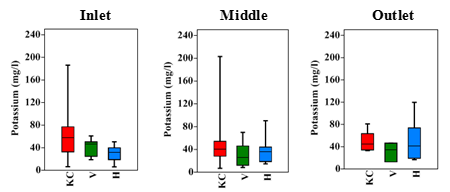 Lakes with continuous inflow of sewage have high concentrations of total hardness, alkalinity and chlorides (Ramachandra et al., 2013). Elevated chloride values could be due to many factors, including sewage, industrial effluents, and agricultural runoff. Potassium is also an essential element for plant growth. Its elevated levels indicate potential contamination from industrial effluents or fertilizer (Ramachandra, 2008). The main cause of hardness in natural water is due to calcium and magnesium salts combined with carbonates and bicarbonates. The main source of hardness is domestic and industrial washing flowing into the lake (Ramachandra et al., 2001)