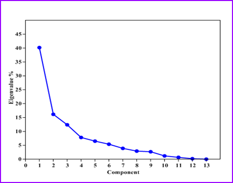 Based on the eigenvalues scree plot (figure 6.3), about 13 physicochemical parameters were reduced to 10 main factors (factors 1 to 10) from the leveling off point(s) in the scree plot. The remaining 3 factors have eigenvalues of less than unity. The table 6.1 shows the corresponding eigenvalues and total variance for each factor extracted. Any factor with an eigenvalue greater than 1 is considered significant. The first factor corresponding to the largest eigenvalue (5.22) accounts for approximately 40.19% of the total variance. The second factor corresponding to the second eigenvalue (2.10) accounts for approximately 16.16% of the total variance.