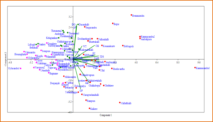 Principal Component Analysis: Principal component analysis (PCA) was performed to investigate the factors that caused variations in the observed water quality variables across various lakes in Bangalore district. PCA provides information on the most meaningful parameters, which will describe the whole data set, and help in data reduction with minimum loss of original information.