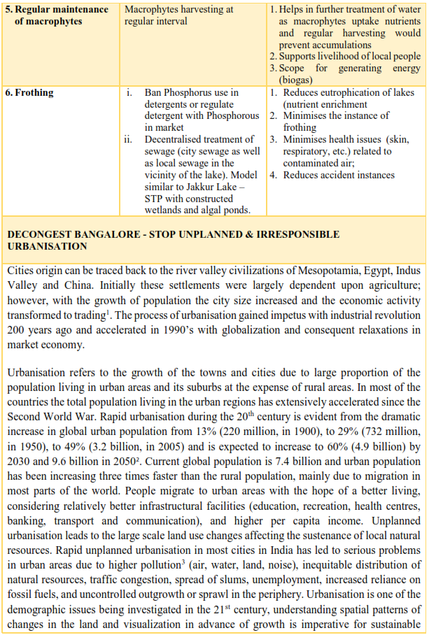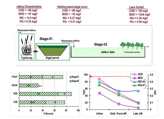 - Decentralised treatment of sewage and solid waste (preferably at ward levels). Sewage generated in a locality /ward is treated locally and letting only treated sewage into the lake (Integrated wetlands ecosystem as in Jakkur lake). Integrated wetlands system consists of sewage treatment plant, constructed wetlands (with location specific macrophytes) and algal pond integrated with a lake. Constructed wetland aid in water purification (nutrient, heavy metal and xenobiotics removal) and flood control through physical, chemical, and biological processes. When sewage is released into an environment containing macrophytes and algae a series of actions takes place. Through contact with biofilms, plant roots and rhizomes processes like nitrification, ammonification and plant uptake will decrease the nutrient level (nitrate and phosphates) in wastewater. Algae based lagoons treat wastewater by natural oxidative processes. Various zones in lagoons function equivalent to cascaded anaerobic lagoon, facultative aerated lagoons followed by maturation ponds. Microbes aid in the removal of nutrients and are influenced by wind, sunlight and other factors (Ramachandra et al., 2014). This model is working satisfactorily at Jakkur. The sewage treatment plant removes contaminants (evident from lower COD and BOD) and mineralises organic nutrients (NO3-N, PO43- P) to inorganic constituents. Integration of the conventional treatment system with wetlands [consisting of reed bed (with typha etc.) and algal pond] would help in the complete removal of nutrients in the cost effective way. Four to five days of residence time in the lake helps in the removal of pathogen apart from nutrients. However, this requires regular maintenance through harvesting macrophytes and algae (from algal ponds). Harvested algae would have energy value, which could be used for biofuel production. The combined activity of algae and macrophytes helps in the removal of ~45% COD, ~66 % BOD, ~33 % NO3-N and ~40 % PO43- P. Jakkur lake acts as the final level of treatment that removes ~32 % COD, ~23% BOD, ~ 0.3 % NO3-N and ~34 % PO43- P. The lake water with a nominal effort of sunlight exposure and filtration would provide potable water. Replication of this model in rapidly urbanizing landscapes (such as Bangalore, Delhi, etc.) would help in meeting the water demand and also mitigating water scarcity through recharging of groundwater sources with remediation.