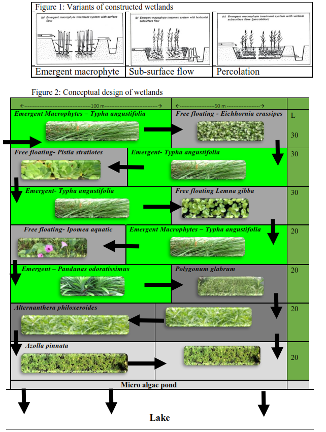 Taking advantage of remediation capability of aquatic plants (emergent macrophytes, free floating macrophytes) and algae, constructed wetlands have been designed and implemented successfully for efficient removal of nutrients (N, P, heavy metals, etc.). Different types of constructed wetlands (sub surface 0.6 m depth, surface: 0.4 m, could be either horizontal or vertical) are given in Figure 1. Area required for constructed wetlands depends on the influent sewage quality and expected treatment (BOD removal, etc) is given in equation 1 (Vymazal et.al, 1998). Estimates show that to treat 1 MLD influent, area required is about 1.7 hectares. Figure 2 gives the design of wetlands to treat 1 MLD.