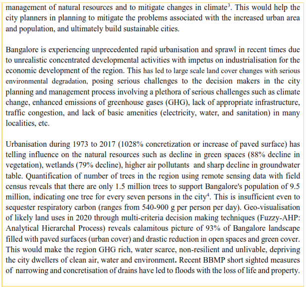 Constructed Wetlands: The loss of ecologically sensitive wetlands is due to the uncoordinated pattern of urban growth happening in Bangalore. This is due to a lack of good governance and decentralized administration evident from a lack of coordination among many para-state agencies, which has led to unsustainable use of the land and other resources. Failure to deal with water as a finite resource is leading to the unnecessary destruction of lakes and marshes that provide us with water. This failure in turn is threatening all options for the survival and security of plants, animals, humans, etc.