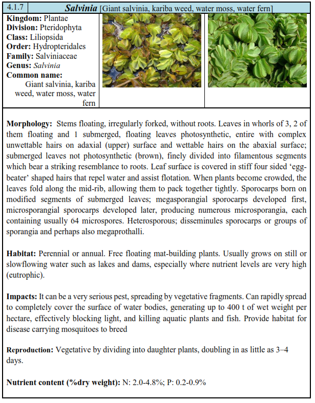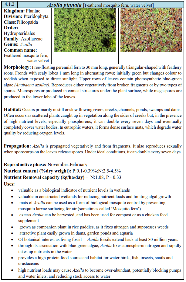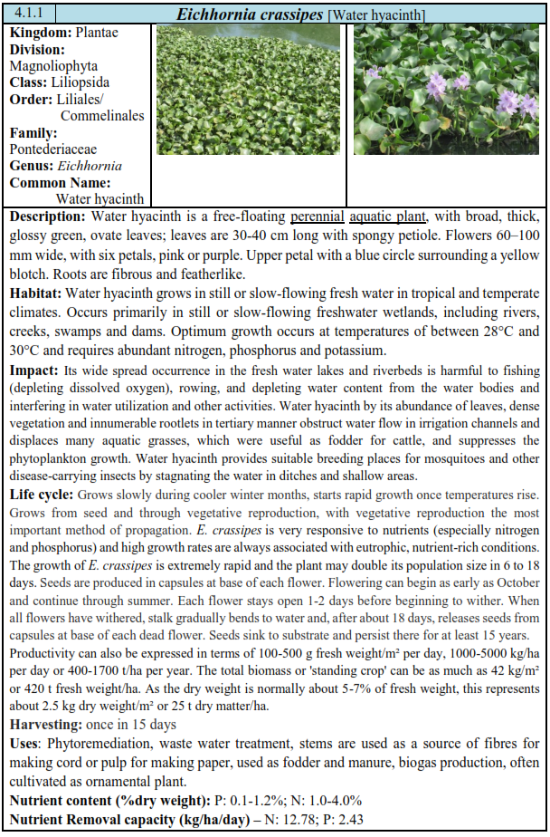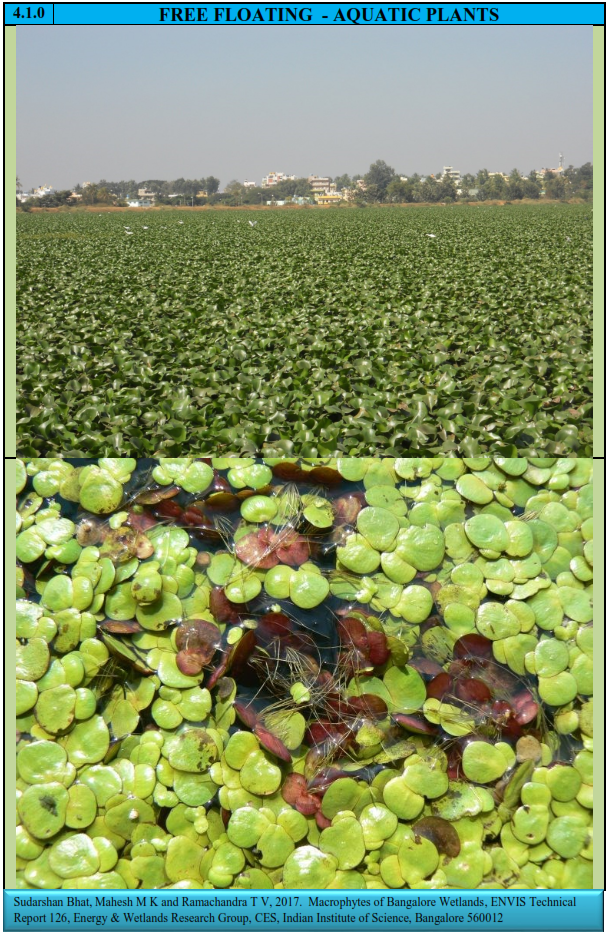 - Floating macrophytes: Entire plant will be floating on the water surface (Eichhornia, Lemna, Pista etc); Floating attached macrophytes.