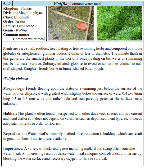 Aquatic macrophytes are the vascular plants that are normally found growing in wetlands, either in or on the water, or where soils are flooded or saturated long enough for anaerobic conditions to develop in the root zone (Cowardin et.al 1979). The aquatic macrophytes occur mainly in the shallow region of lakes ponds, pools, marshes streams and rivers etc. Macrophytes are of considerable ecological and economic importance as they help in the uptake of nutrients and hence help in maintaining the chemical integrity of the respective ecosystem. They contribute significantly to the productivity of water bodies; mobilize mineral elements from the bottom sediments and provide shelter to aquatic macro invertebrates and fishes. They also respond to changes in water quality and have been used as indicators of pollution and are known as ‘bio-indicators’. When there is enough room for colonization and abundant availability of nutrients, macrophytes show a high growth rate. They assimilate nutrients directly into their tissues. Due to these they were used to solve eutrophic problems of freshwater bodies and to remove pollutants. Aquatic macrophytes belong to the following 3 categories on the basis of their habit: