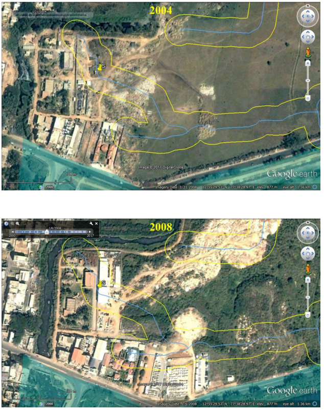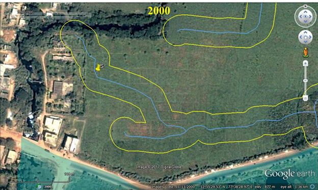Causal Factor 3 – Erection of compound wall: The compound walls were erected in the wetlands region, hindering flow of water. These structures violating the hydrologic regime as (i) the compound walls inside wetlands restrict the movement of water from upstream to downstream, (ii) compound wall is being built (after filling  and altering the topography) altering the wetlands physical integrity. Figure 8 depicts the Compound walls on Google earth. Figure 9 depicts the status of compound walls in 2014 and 2017. IT can be observed that a new boundary has been erected in 2017, but the land is seeming not be rejuvenated to the original status.
