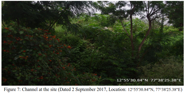Figure 3 and Figure 4 demonstrates the alterations in the wetlands region observed at the site at sites in 2014 and 2017 field visits. Large scale construction debris, Soil and Solid waste filled, over which construction activity was under progress. Figure 4 also depicts the concretized channel and violation of norms. The channel has been reduced in width from 45 m to nearly 20 m (Figure 5).
