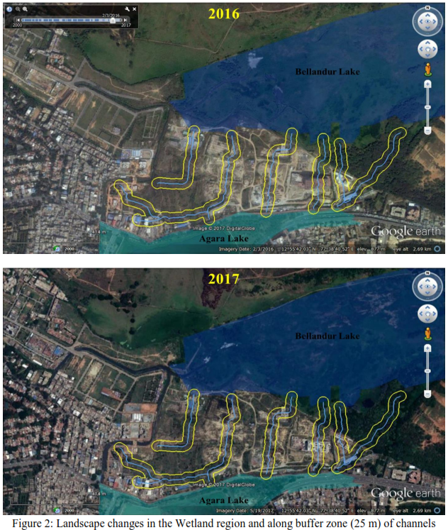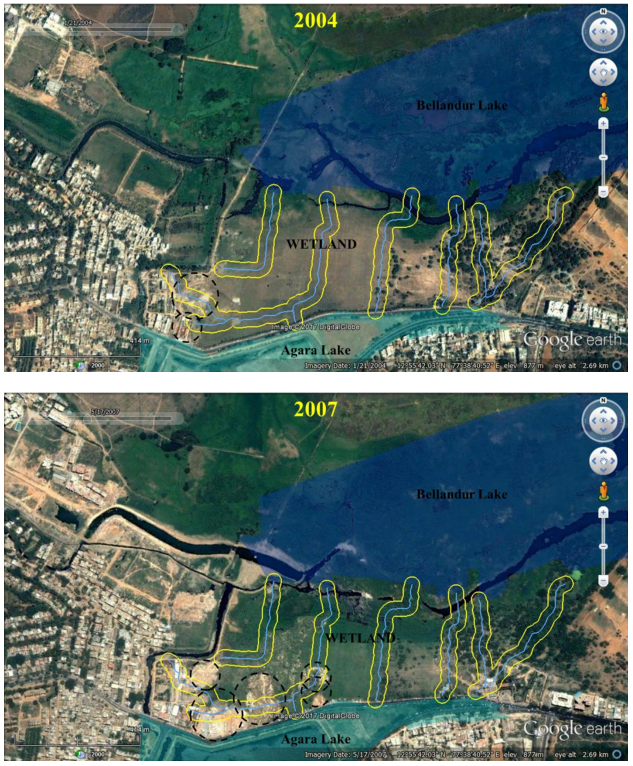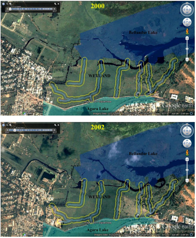 Bellandur-Agara wetland’s integrity is altered due to  (i) filling of low lying area with construction debris, (ii) removal of interconnecting drains (visible in remote sensing data of 2000, Figure 2) , (iii) narrowing and concretizing drains to aid the encroachment. Figure 1 indicates the Revenue map of Agara village indicating Wetland under study. Cyan line in the revenue map indicates channels connecting Agara and Bellandur lakes along the wetland