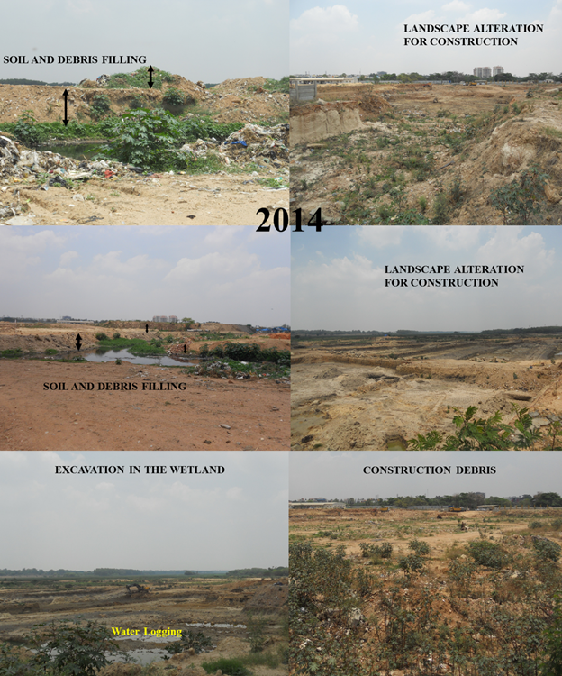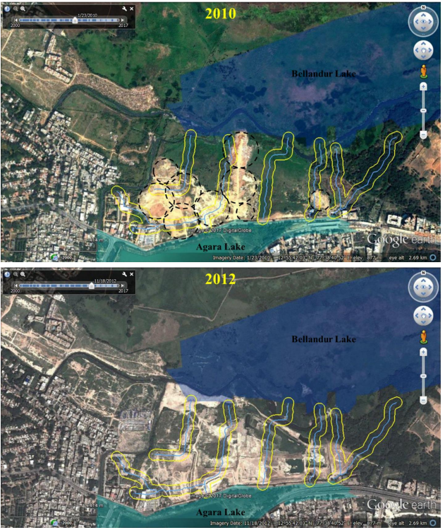 Land cover dynamics in the wetland of Agara Bellandur lake is as presented in Figure 2. It is observed that since 2002, construction debris, soil were constantly dumped in the wetland, altering the topography (undulating terrains are levelled). The wetland was completely altered in 2012 with the disappearance of connecting drains due to large scale filling, excavations for construction activity. Now, only drains in the army campus exists.
