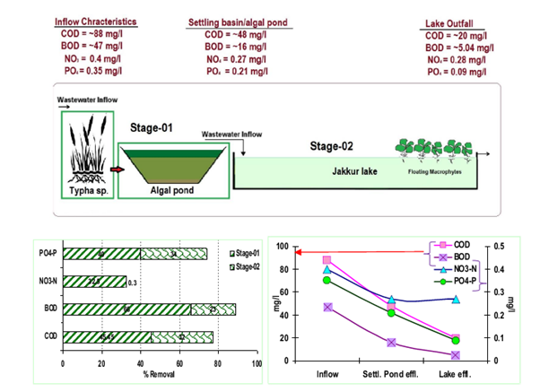 Integrated wetlands system consists of sewage treatment plant, constructed wetlands (with location specific macrophytes) and algal pond integrated with a lake (figure 3.1). Constructed wetland aid in water purification (nutrient, heavy metal and xenobiotics removal) and flood control through physical, chemical, and biological processes. When sewage is released into an environment containing macrophytes and algae a series of actions takes place. Through contact with biofilms, plant roots and rhizomes processes like nitrification, ammonification and plant uptake will decrease the nutrient level (nitrate and phosphates) in wastewater.  Algae based lagoons treat wastewater by natural oxidative processes. Various zones in lagoons function equivalent to cascaded anaerobic lagoon, facultative aerated lagoons followed by maturation ponds. Microbes aid in the removal of nutrients and are influenced by wind, sunlight and other factors (Ramachandra et al., 2014). This model is working satisfactorily at Jakkur. The sewage treatment plant removes contaminants  (evident from lower COD  and BOD) and mineralises organic nutrients (NO3-N, PO43- P to inorganic constituents. Integration of the conventional treatment system with wetlands [consisting of reed bed (with typha etc.) and algal pond] would help in the complete removal of nutrients in the cost effective way. Four to five days of residence time in the lake helps in the removal of pathogen apart from nutrients. However, this requires regular maintenance through harvesting macrophytes and algae (from algal ponds). Harvested algae would have energy value, which could be used for biofuel production. The combined activity of algae and macrophytes helps in the removal of  ~45% COD, ~66 % BOD, ~33 % NO3-N and ~40 % PO43-P.  Jakkur lake acts as the final level of treatment that removes ~32 % COD, ~23% BOD, ~ 0.3 %  NO3-N and ~34 % PO43-P.  The lake water with a nominal effort of sunlight exposure and filtration would provide potable water. Replication of this model in rapidly urbanizing landscapes (such as Bangalore, Delhi, etc.) would help in meeting the water demand and also mitigating water scarcity through recharging of groundwater sources with remediation.