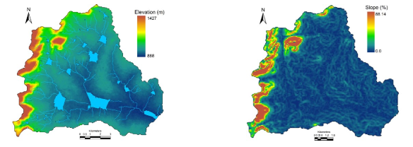 Ajjawara watershed is bounded by Rocky hills in the west. Elevation in the watershed varies between 888m to 1427m AMSL (Figure 5.2). Slopes (Figure 5.2) are gentle across the catchment and steep at the hillocks. Slope ranges between 0% to 88.14%.