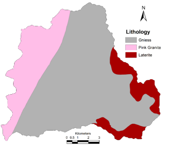 Soils vary between loamy to clayey (Figure 5.3) (http://eusoils.jrc.ec.europa.eu/, National Bureau of Soil Survey and Land Use Planning). Rock type includes Gneiss, Pink Granite and Laterite (Figure 5.4). Ground water status is as depicted in Figure 5.5 (Central Ground Water Board), on an average in the catchment, Ground water is under moderate condition.
