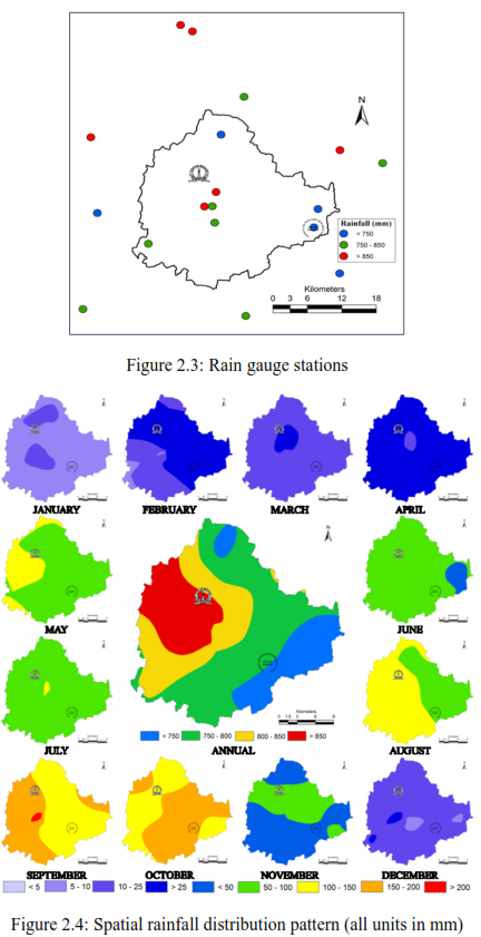 Rainfall or precipitation data was collected from 18 monitoring stations (Figure 2.3) maintained by Indian Meteorological Department (IMD) and Directorate of Economics and Statistics – Karnataka between 1901 to 2015.  115 years average rainfall data was considered to understand the rainfall dynamics – spatio temporal variability, etc.  in Greater Bangalore (Figure 2.4). Spatial Analysis of rainfall indicates that the western portion of Bangalore receives higher rainfall than the east. Monthly analysis (Figure 2.3, Figure 2.4) of rainfall indicated that rainfall in Bangalore is spread across 7 months i.e., 86.9% of rainfall occurs between the months of May to November, September being the highest with average rainfall of 156 mm (Figure 2.5).