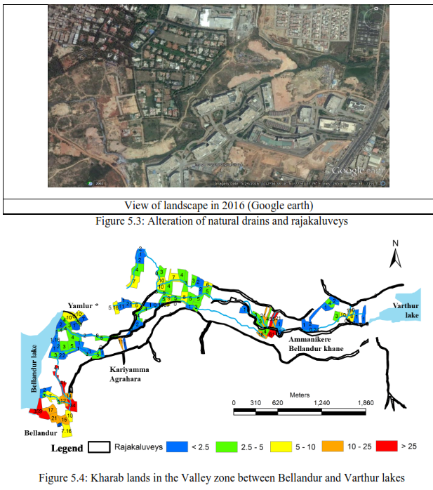 Valley zones: Bangalore has the distinction of having inter connected lake systems. Valley zones connecting two lakes are to be protected to ensure the continuation of hydrological functions of the drains and flood plains. These have been designated as sensitive regions as per the revised master plan 2015 (RMP 2015 of BDA). However, valley zones in Bangalore are being abused despite norms to protect these fragile ecosystems. For example, Pristine Bellandur-Varthur wetland ecosystem has been experiencing threat due to the large scale catchment alterations with changes in the land use land cover. The region forms a part of primary valley, which is sensitive regions as per the revised master plan 2015 (RMP 2015 of BDA). The landscape forms an integral part of the protected area (as it is in valley zone) as per the CDP 2015. This wetlands is now being converted with mixed land use i.e., Built-up with both residential and office complexes. Alterations in the wetland began in 2004 and aggravated post 2008. The alterations of these wetlands initiated by filling the low lying areas with excavated earth debris, followed by other construction activities. The land fillings have breached both rajakaluve and lakes. Rajakaluve have reduced in width from as high as 35m to less than 8 m, apart from the loss of natural stream network connecting the lakes and rajakaluveys. Major violations in Bellandur-Vathur wetlands are: