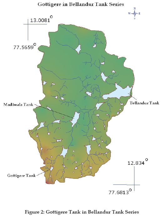 The Gottigere tank is part of the South Pennar river basin and is an important feeder tank to the Hulimavu and Madiwala tanks, which eventually feed to Bellandur and Varthur tanks. It has a water-spread area of 14.98 Ha. The location of the tank in the Bellandur tank series is depicted in Figure 1 and Figure 2, which gives a panoramic overview of the tank and the tank in Belandur watershed. The rainfall data for the region is available for the last 100 to 110 years. Rainfall varies from 725.5 mm to 844.8 mm. The district receives 51 % of the total annual rainfall in the southwest monsoon period, i.e. June to September. The average annual rainfall in the catchment was 859 mm in 1999. April is usually the hottest month with the mean daily maximum and minimum temperature of 33.4° C and 21.2° C respectively. December is generally the coolest month with the mean daily maximum and minimum temperature of 25° C and 15.3° C respectively. The temperature drops down to 8° C during January nights. Relative humidity is high from June to October (80 to 85 %). Thereafter, it decreases and from February to April becomes 25 to 35%. The relative humidity in the morning is higher than in the evening, giving rise to the formation of fog.