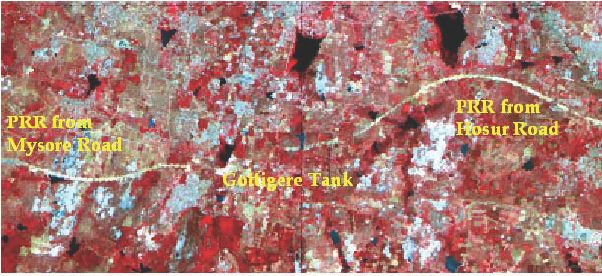 The land use changes already initiated by the alignment of the Peripheral Ring Road (PRR) is analysed based on the satellite remote sensing data for the years 2000 and 2006. The satellite remote sensing data of Landsat ETM+ for 2000 was obtained from Global Land Cover Facility and the LISS-III data for 2006 was obtained from National Remote Sensing Agency, Hyderabad. These data were pre-processed for image geo-registration and rectification. The false colour composites (FCC) for these two time periods were created (Figure 4 and 5) to compare the land use changes through visual interpretation.