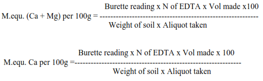 Procedure: 1)Calcium and Magnesium: Transfer 10 ml of ammonium acetate soil extract into a conical flask and add 5 to 10 ml buffer complex to get pH of about 10, add EBT indicator and titrate the content with standard EDTA till color changes from pink to blue.