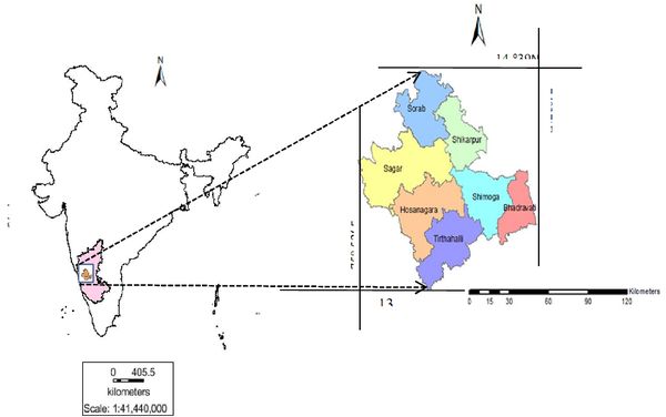 SHIMOGA, a malnadu district of the Karnataka State with a geographical area of 8477 sq.km is situated in the mid-south-western part of the State at 13°27' and 14°39'N and 74°37' and 75°52'E (Shimoga district statistics, 2011). The district is bounded by Uttara Kannada district on the northwestern side, Udupi district on the south western side, Chickmagalur district on the south and south eastern side, Davangere district on the eastern side and Haveri district on the north eastern side (Figure 1).