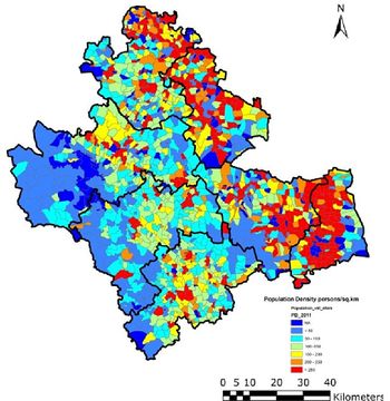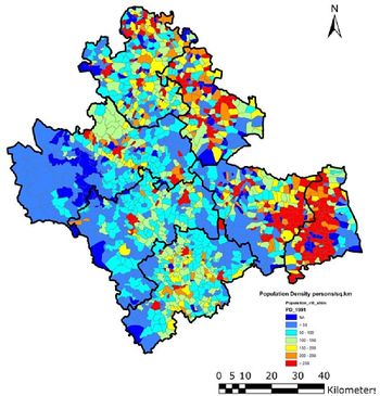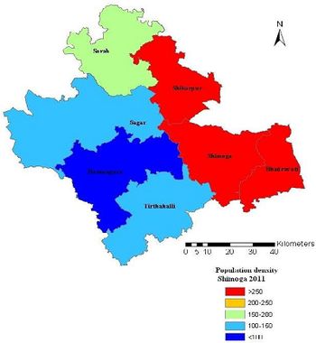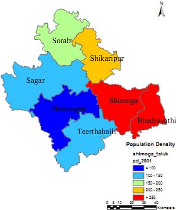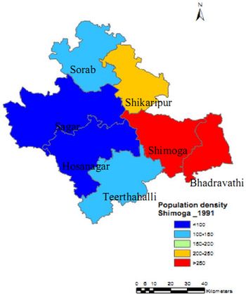 Current population in the district is 17,52,753 and there has been an increase of 6.7% during the last decade. The population in 2001 was 16,42,545 with a population density of 193.77 per sq km implying a growth of 13% during 1991-2001 (http://censusindia.gov.in). The Shimoga taluk with the maximum and Hosanagara taluk minimum population density as can be seen in table 2. Nearly 65% of Shimoga district lives in villages and remaining 35% in towns. Table 1 lists rural and urban population density in 2001 and 2011. There has been an increase of 6.7% during 2001 (1642545) to 2011 (1752753), which is relatively lower compared to 1991-2001 (13.1%). Male population has increased by 5.6% while female population shows an increase of 7.8% during the last decade. Talukwise population and population density is given in Table 2. The district has population density of 206 persons per sq.km (2011) with highest in Badravathi (503.9), followed by Shimoga (462.24) and lowest in Hosanagar (86.16).Talukwise population increase show the variation from 2.2 (Sagar) to 12.06 (Shimoga taluk) during 2001 to 2011. Spatial distribution of population density during 1991, 2001 and 2011 is given in Figure 2, 3 and 4 respectively. Villagewise population densities during 1991, 2001 and 2011 are given in Figure 5, 6 and 7.