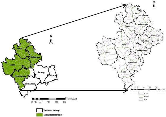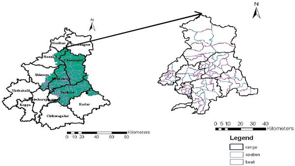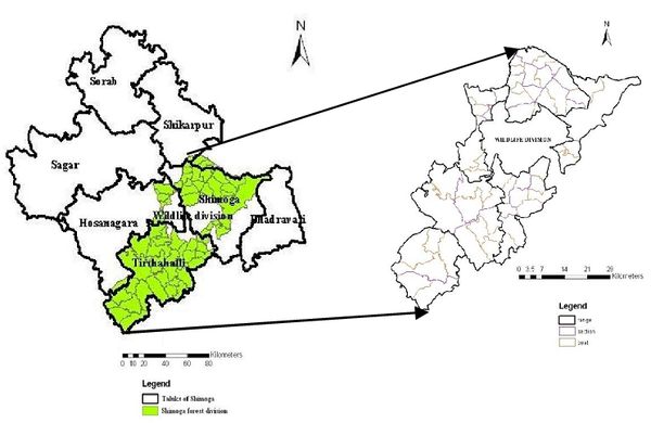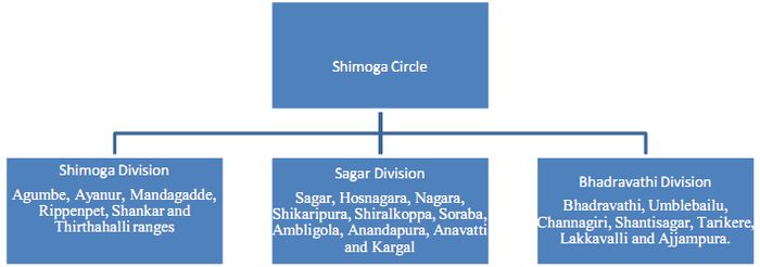 The administration of the Forest Department in the district is under the charge of the Conservator of Forests (CF), Shimoga Circle, Shimoga. The district has been divided into three Forest Divisions, namely, Shimoga, Bhadravati and Sagar Divisions (Figure 1), each headed by a Divisional Forest Officer (DFO). There are thirty three forest ranges corresponding to the seven revenue taluks of the district. Each forest range is placed under the charge of a Range Forest Officer (RFO). The ranges are further divided into sections, and each section is under the charge of a Forester. Further, each section is sub-divided into beats, and each beat is under the charge of a Forest Guard who is assisted by a Watcher. Thus, there are thirty three Range Forest Officers (in the district under the administrative control of the three Divisional Forest Officers. And they are assisted by 12 Assistant Conservator of Forests ACF), 33 Range Forest Officers; in all three Forest Divisions (Annual report, Shimoga circle 2012).