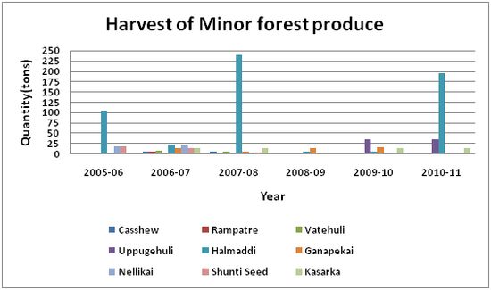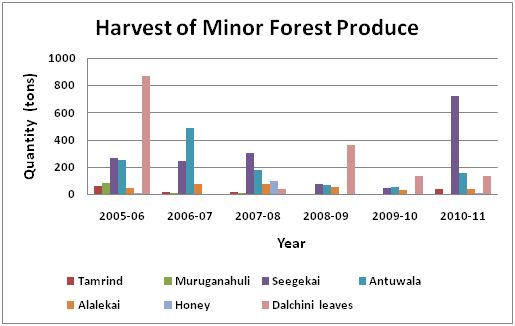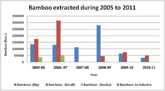 Bamboo: The dead and dry bamboos were removed for the supply to Mysore Paper Mills Ltd. Green big and small bamboos are supplied to local Medars and for bonafide users from various depots.In order to meet requirement of local people and others, greenbamboo is removed as per silvicultural principles. Figure 6 depicts the quantum of bamboo extracted during 2005-06 during 2010-11.