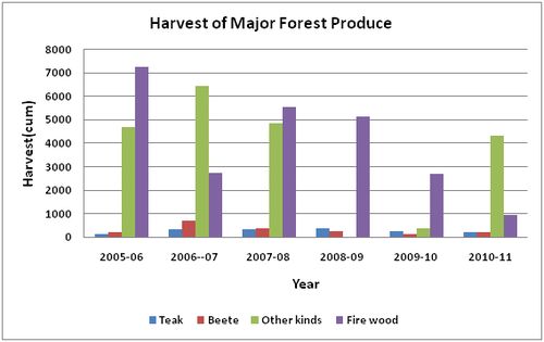 Firewood: Firewood extracted from forests is sold to public from various depots through Karnataka State Forest Industries Corporation in Bhadravathi town.There is a demand for firewood from distant places like Davanagere,Chitradurga, etc. The firewood requirement is met partly from harvest of Acacia auriculiformisplantations of the department and partly from the harvest of captive plantations of the MPM Ltd(Working Plan, Shimoga division).The MPM Ltd., as per the agreement conditions of the lease, concedes 12.5 % of the harvested produce to the Forest Department as lease rent for the land. Lops and tops of the plantations after harvest and removal of firewood and pulpwood are used by the neighbouring villagers. Figure 5 illustrates the major forest produces (teak, fuelwood, etc.) during 2005-06 to 2010-11.