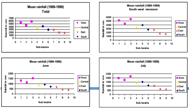 The sub-basins were further classified into clusters viz. west, east, south and central depending on their geographical locations. The mean rainfall (1989-1999) was determined for each sub basin in order to observe the rainfall variation and distribution within the river basin. They were classified as follows: