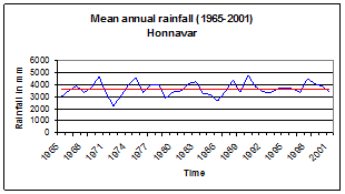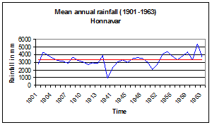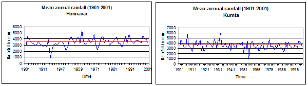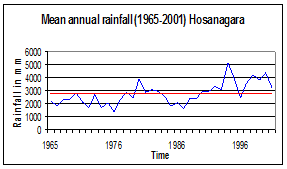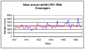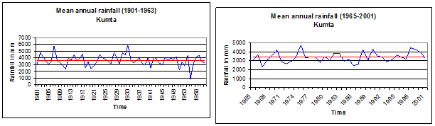 Figure 5.6: Annual rainfall (Soraba) Figure 5.7: Annual rainfall (Tirthahalli) Figure5.8: Annual rainfall (Honnavar) Figure5.9: Annual rainfall (Kumta) Figure 5.10: Annual rainfall (Siddapur) Figure 5.11: Mean annual rainfall Figure 5.12: Mean annual rainfall (1901-1964) (Hosanagara) (1965-2001) (Hosanagara)