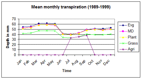 Mean monthly interception of each vegetation in the study area is given in Table. 5.16 From the data, evergreen/semi-evergreen forests have higher interception as compared to other vegetation types. Similar conclusion have been drawn from other studies that in wet conditions, interception losses will be higher from forests than shorter crops primarily because of increased atmospheric transport of water vapour from their aerodynamically rough surfaces.