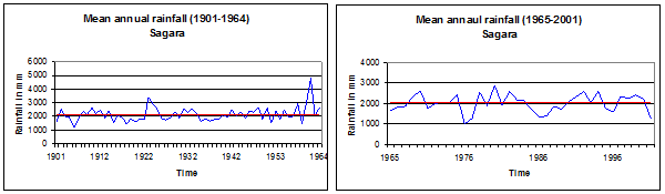 Yearly data for hundred years were available for 7 taluks in and around the river basin viz. Hosanagara, Sagara, Soraba and Tirthahalli (Shimoga district) and Honnavar, Kumta and Siddapur (Uttara Kannada district). Since these are the taluks surrounding the river basin, rainfall analysis is done to study any variation in rainfall for 100 years. The rainfall periods were divided into 1901-1964 and 1964-2001, which represents respectively the periods before construction and after construction of Linganamakki dam. The graphs depict the rainfall variation in all taluks for the 2 periods. The highest rainfalls in Hosanagara occured in 1961 and 1994 with 5175 mm and 5110 mm respectively. Sagara experienced high rainfall of 4826 mm in 1962 and low rainfall of 993m in 1976. Low rainfall was also recorded in Soraba consecutively for 4 years during 1979-1982 with the lowest recorded in 2001. Tirthahalli recorded maximum rainfalls of 6400 and 6115 during the first period (1901-1963) and a maximum rainfall of 4044 during the second period (1965-2001). Analysis of 100 years rainfall in the various taluks in and around the river basin were done to study any discrepancies in the rainfall for two periods viz. 1901-1964 (before construction of dam) and 1964-2001 (after construction of dam). Figure 5.4: Annual rainfall (Hosanagara) Figure 5.5: Annual rainfall(Sagara)