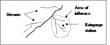 Regression analysis was carried out for each rain gauge station considering rainfall as dependent variable and latitude, longitude, altitude and land cover as independent variables. The area of influence of each rain gauge station was delineated with respect to contours and drainage as shown in Figure 5.28 and the land cover expressed as NDVI was determine using the imagery for each area around the gauge Figure 5.28: Area of Influence of a Rain Gauge Station