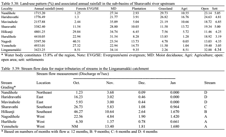 From Table 5.4, it is seen that natural forests such as evergreen/semi-evergreen and moist deciduous forests have decreased by 28.2% whereas monoculture plantations (due to afforestation work of the forest department) have increased by 17.3%. Grasslands and scrubs have decreased by 28.4% in 1999 but this can be attributed to the season as in summer, grasses dry out leaving only the scrubs. The main anthropogenic activity apart from plantation is paddy cultivation, which has increased by 5% in 1999. Paddy cultivation is the most common agricultural activity in the basin and is usually grown in valleys. Shimoga ranks first among the other districts of the state as far as paddy is concerned (KSG, 1975). Human population has also increased in the basin and has been reported that there has been immigration of people from adjoining districts of Karnataka and also from neighbouring States (KSG, 1975). In recent years, few people from drought affected districts of Gulbarga and Bidar to Shimoga district to work on daily wages. A large number of seasonal in-migrants visit the villages at different seasons of the year. They arrive in large numbers in October-November and continue to stay there upto the end of about February-March. Some factory workers from Bhadravati town also come to villages to work on the agricultural lands during peak harvesting season. Another major activity that has been beneficial to the villages in Sharavathi and also adjoining districts is the setting up of the Linganamakki Dam across the Sharavathi River. The Sharavathi Hydroelectric Project formerly known as Honnemaradu Project was taken up by the State Government in 1956, to utilize the potential of the river. It has been one of the important undertakings of the state in the field of economic development (KSG, 1975). A dam of nearly 2.4 kms long has been put across this river at Linganamakki in Sagar taluk of Shimoga district. It was so designed as to impound 4368 million cubic meter of water in an area of around 300 km2, submerging 50.62 km2 of wetland, 7 km2 of dry land and 3.9 km2, the remaining being forest land and wasteland. Although the dam has provided electricity, water and other benefits to the surrounding areas, it has proved to be at the cost of the valuable ecosystem. Evergreen forests are being cleared to yield timber, which are used for electric transmission poles and railway sleepers. The felled areas are sometimes tended for getting the natural regeneration of valuable species. Deciduous forests supply timber, firewood, charcoal, bamboo, matchwood and plywood. Plantations of teak, silver oak (Gravillea robusta), matchwood etc are sometimes replaced for clear felled forests. Table 5.5 and Table 5.6 give the sub-basin wise area under different land uses. Table 5.7 gives the overall change in 1999. Table 5.5: Area of Land use in Sub Basins (sq.km)1989