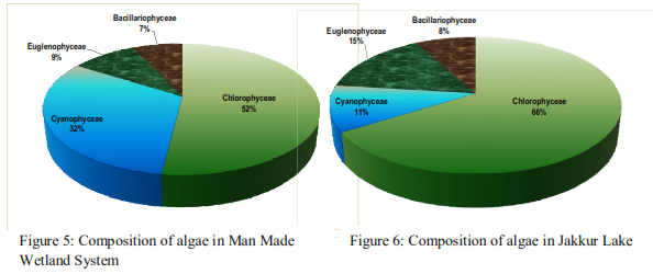 Jakkur STP (of 10 MLD capacity)  treats only 6 MLD of sewage that is drawn from Yelhanka town. Yet, It is observed that sewer channel carrying voluminous wastewater with the treatment plant effluents into wetlands. The major nutrient removal and polishing is done by the manmade wetland and the lake. This wetland comprise of emergent macrophytes as Typha augustata, etc and plays a key role in oxygenation of soil subsystems through root zone oxidation and entrapment of necessary nutrients that otherwise would cause an algal bloom in the lake. The algal species in this manmade wetland region (Figure 5) primarily comprised of memebers of chlorophyceae followed by cyanophyceae, eugelnophyceae and bacillariophyceae (Figure 6). The relative abundances are provided in the pie-diagrams below. The detailed list of algal species, their presence and absence have been listed and provided in Table 4.