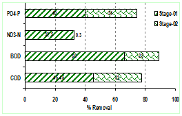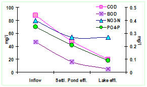 The nutrient analysis shows (illustrated in Figure 4), that treatment happens due to  immergent macrophytes of the wetlands and algae, which  removes  ~45% COD, ~66 % BOD, ~33 % NO3-N and ~40 % PO43—P.  Jakkur lake treats the water and acts as the final level of treatment which shown as stage two that removes ~ 32 % COD, ~23% BOD, ~ 0.3 %  NO3-N and ~34 % PO43—P.. The synergestic mechanism of sewage treatment plants followed by wetlands helps in the complete removal of nutrients to acceptable levels according to CPCB norms.