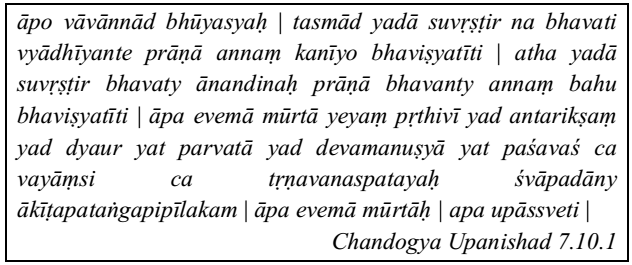 Water is one of the fundamental elements of the universe from which early life originated millions of years ago on earth. Every life on earth is primarily dependent on water which hosts innumerable aquatic species from single cell creatures to gigantic blue whales. As the evolution of human took place, civilized human settled down on the fertile river banks. In other words, river banks are the motherhood for civilized human and most of the civilization around the world. These river or lake banks gave water for drinking and also for cropping along with mineral rich soil. Civilized men knew the importance of water and respected these water bodies. These people worshipped those elements of the nature which were powerful and were capable of destruction. Any realy civilization worshipped Sun - the God of Light, Fire – as God Agni, Wind – as God Vaayu and Rain (Water) as God Varuna. The oldest ever known Indian mythology also worshipped the nature as Pancha Bhutas (Five fundamental elements) viz. Agni (Fire), Vaayu (Wind), Varuna (Water or Rain), Bhoomi (Soil or Mother Earth) and Akaash (Space). The importance of water and environment are often discussed in Vedas and Puranas, which are the oldest literatures of the human history. Vedas and Purans mainly deal with the cosmic energy and the ultimate salvation of the material body. These literatures emphasize about the nature and worshipping nature in the form of Pancha Bhutaas, which is also a way of conserving its serenity. For example, water being, both a divinity and a daily consumable to Vedic Indians helped them build up stronger trust on and more sensible familiarity with it. The geographical information retrievable from the Vedas reveal that, in addition to rain, rivers, lakes, fountains and other reservoirs are the major source of water [1], which were accurately recognized and named according to their characteristics, location and people’s impression. Righvedha mentions about thirty rivers in varying frequency, including the famous saptasindhu (seven rivers) and pañca-āp (five-waters) which covered the area now known as Punjab. [2, 3,4,5]. It can be noted that almost all rivers in the Vedas have feminine names ending with elongated vowels which alludes to, their beauty, gait and motherly qualities [4, 5]. Further significance of constructing tanks and lakes is highlighted though “a person who constructs a tank attains 100 million times more excellence than those who perform the ritual of Ashwa medhayaaga and goes directly to heaven in a fine chariot. Furthermore, since cattle and other animals drink water from the tank, the person who builds a tank is absolved of any sin in life. Gifting water through construction of a reliable water source was also considered to be worthy and more important than having 1000 children. Early civilization had the knowledge about medicinal aspects of particular rivers due to the origin and flow regime. Water elixir of life evident from, Gange cha Yamune chaiva Godavari Saraswati, In this water, I invoke the presence of holy waters from the rivers Ganga, Yamuna, Godavari, Saraswati, Narmada, Sindhu and Kaveri. In addition to direct addresses such as 'waters are our mothers' (āpo asmān mātaraḥ) [7], there are implication on water's role in parentage of life on the earth. The river Sarasvatī which contains and carries motherly waters is also addressed as ‘mother (ambā)’ [8].