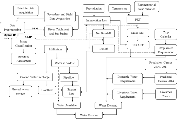 Assessment of the hydrological status: The hydrological status in the catchment is analysed for each month based on the water balance which take into account the water available to that of the demand. The water available in the catchment is function of water available in the water bodies such as lakes, streams and rivers, water in the soil, pipe flow and base flow, whereas the demand in the catchment is estimated as the function of crop water demand, domestic and livestock demand and the evapotranspiration waters. The catchments is said to be stable if the water available caters the water demand completely else the catchment is devoid of water and would lead to drought like conditions in the catchment.