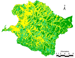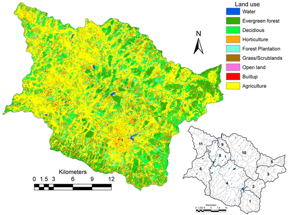 Land use analysis: Land use analysis was carried out for Landsat 8 image of December 2013, the land use under each sub catchment is as depicted in fig. 7a and table 9a. The catchment is dominated by agriculture with over 45.32%, followed by forest land use encompassing an area of 33.38%. The crops in the catchment area are rain fed, and the plantations are dependent upon the lakes and ground water post monsoon.