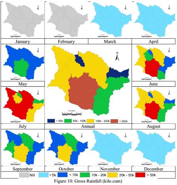 Hydrology: Around 17 rain gauge stations (fig.8) in and around the catchment were considered for the analysis. The daily rainfall data from these stations between 1961 and 2010 were analysed for each of the rain gauge every month, in order to check for missing data and also to understand the trend in the monsoon variations across years (fig. 3). The assessment show that rainfall in the catchment is depleting over time. The spatial variation of rainfall is as depicted in fig. 9, rainfall in the region starts from June up to October. The annual variations indicate that the rainfall is less than 2500mm at the plains where as it is over 3000 mm towards the southwest.