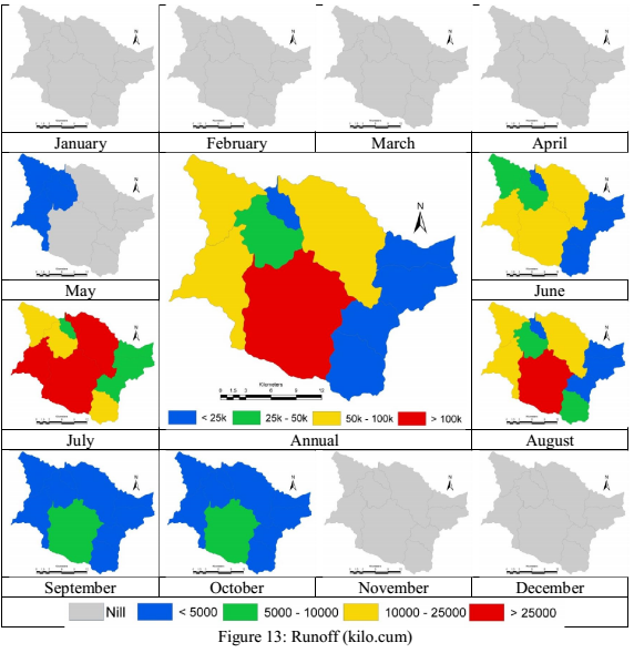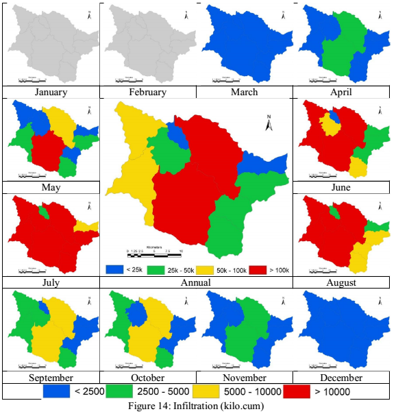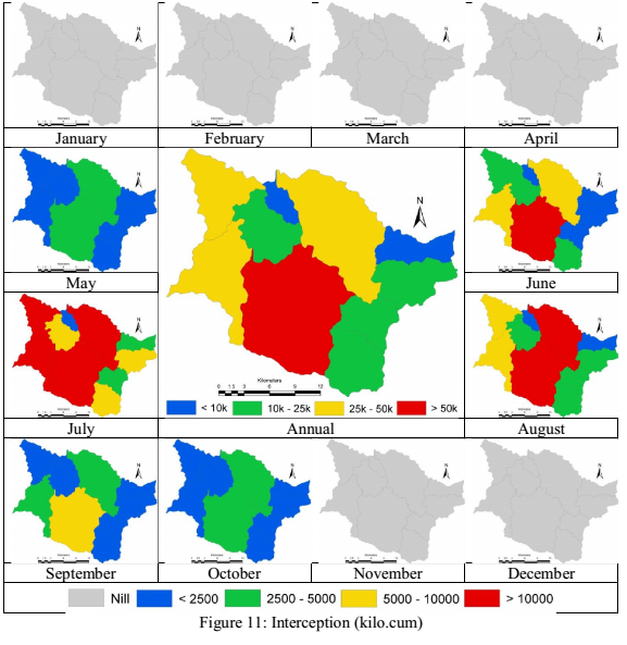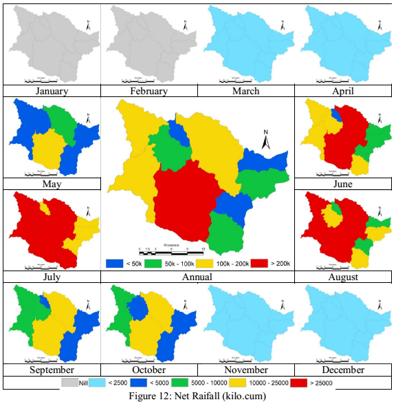 Gross rainfall yield in each of the sub basins is as depicted in fig. 10. As gross rainfall is product of precipitation and area under each sub basin, the rainfall yield shows higher values even in cases where the rainfall is low in the basin. Interception in each of the basins based on the regional land use and precipitation was derived, and is as depicted in fig. 11, regions with higher canopy cover has higher interception losses; the intercepted water contributes to evaporation during monsoon. Net rainfall is the difference between the gross rainfall and interception loss in each sub basin and is depicted in fig. 12. Runoff assessment was carried out using the empirical equation as a function of land use, precipitation and area of sub basin as is as depicted in fig. 13. Direct surface runoff in the basin is between June and October, the overall runoff in the basin is about 375 Million cubic meters (i.e., about 13 TMC of water). Infiltration in each of the sub catchment were assessed as function of net rainfall and runoff, and is as depicted in fig. 14, during non-monsoon most of the precipitation water percolates into the soils and sub strata.