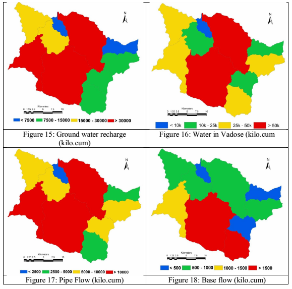 Ground water recharge was estimated based on Krishna Rao’s equation and is as depicted in fig. 15, regions with higher forest and large water cover depict higher recharge capabilities. Water in the sub surface, stored as vadose water is as depicted in fig. 16, catchments with higher forests indicate that the water is stored in a larger volume and for a longer duration. Portion of the water in vadose due to lateral movement moves as Pipeflow supporting the flow in the streams, maintaining water in lakes, fig. 17 depict the annual pipe flow in various sub catchments. The base flow depending on the ground water yield identified in other catchments and based on literature, was estimated for all the sub catchments and is depicted in fig. 18.