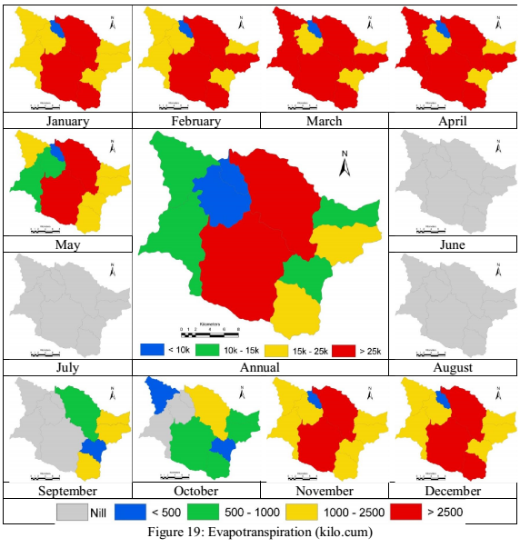 Evapotranspiration for each of the months was estimated based on the Hargreaves equation and the evaporative coefficient (FAO and other resources) for various land uses. The AET during monsoon was negligible since interception (portion of water standing on tree top, buildings, etc. inclusive of evaporation), and transpiration from the crops were considered as nill since crop water requirements were inclusive of transpiration. Fig. 19 depicts monthly evapotranspiration from various land uses.