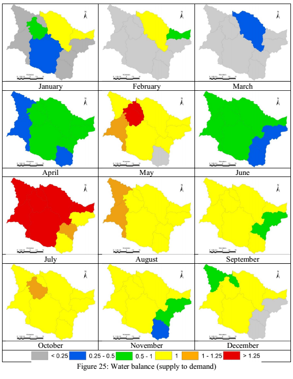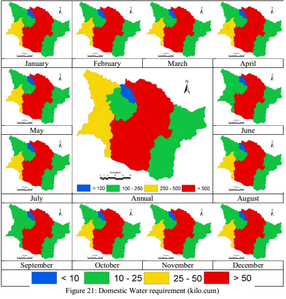 Domestic water requirements were estimated based on the population in each of the catchment, catchments with higher population demands higher water. Water requirement per person as product with population was used to derive the domestic water requirements and is depicted in fig. 21. The Livestock water requirements were quantified similar to the domestic but various categories of livestock were taken into account, fig. 22 depicts the monthly livestock water requirement.