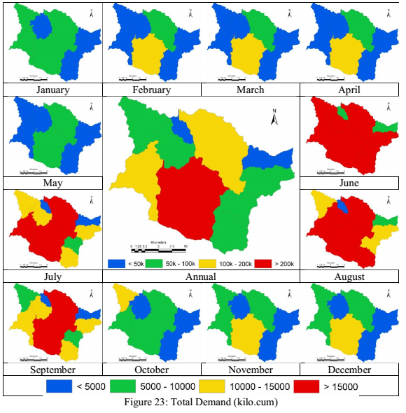 Crop water requirement was estimated based on literature, crop water data from irrigation department, agriculture portals and public interviews, it was established that most of the crops grown are only during monsoon, and few cash crops such as sugar cane, horticulture crops need long term water supply and in large quantity. The area under each crops were estimated based on the data available from district at a glance. Fig. 20 depicts monthly crop water requirements. Catchment with higher horticulture activities indicates that the crop water requirements are high in comparison with other catchments.