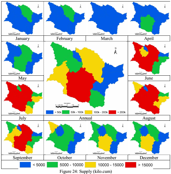 The water demand in the catchment was estimated as the sum of crop water requirement, domestic water requirement, livestock water requirement and evapotranspiration. The total demand of water in each of the catchment is as depicted in fig. 23. Catchments with higher horticulture demand more water, rather than the forest which show that they use less water. Supply of water is taken as a function of runoff during the monsoon, followed by the sub surface waters (vadose water and ground water) during the post monsoon. The water catered as a part of supply is depicted in fig. 24. The ratio of supply to the demand was calculated in order to check what portion of water demand in the region being satisfied by the water available in the basin, and is as depicted in fig. 25. The results show that in most of the sub catchments, since the demand is higher due to various agricultural and horticultural practices, associated with lower forest cover, only partial demand of water is fulfilled. The lakes in series provide water acting as source during post monsoons. In many a cases lakes with kans on their upstream have water throughout the year, catering to most of the human needs.