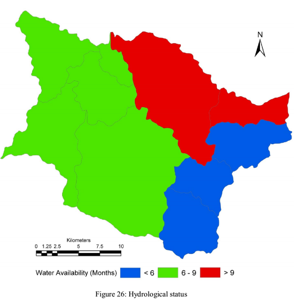 The capability of the water resource to completely cater the demand is as in fig. 26. It could be seen that, water can cater to complete demands over 6 to 9 months. But during rest of the seasons post monsoon, only partial demand can be met with the naturally available water (*naturally refers to the water in the streams, lakes and water due to lateral flow of water from sub-surface (in vadose )).